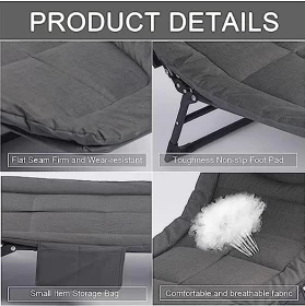 Removable and washable bed surface, filled with 3cm compression sponge, cool and breathable in spring and summer, warm and comfortable in autumn and winterFeatures & SpecificationsSuitable for indoor (office nap, lunch break, home), outdoor (camping, beach)Ergonomic design to reduce muscle tension and stressLays completely flat and has a perfect balance between firmness and softnessThe outdoor patio lounge chair is made of quality iron pipe with 25mm thicker pipe diameterRemovable and washable bed surfacewith high resilience sponge headrest, soothing shoulders and necksMaterial: metal steelDimensions unfolded: 200 x 62 x 32 cmDimensions folded: 62 x 84 cm