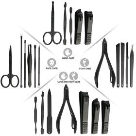 High Quality Manicure Set – 18 pcs1. High quality stainless steel, not easy to rust and durable.2. Button box and round-arc corner design, easy to store and carry and travel. 3. The edges of each tool are deeply polished for comfortable using.4. Inner PU leather design is dust-proof, mould-proof, easy to clean and healthier.5. Sharp and hardness enough for easily cutting your nails.6. Mutil-function: including hand care, foot care and facial treatment, each tool is elaborately made and can meet your all kinds of care needs in daily life.