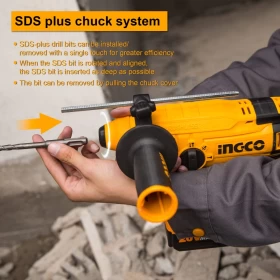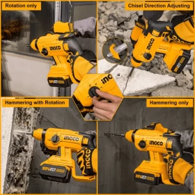Design: 360° Rotary rubber covered auxiliary handle makes it more convenient and comfortable to use, powerful brushless motor and SDS plus chuck system.Function: 4 in 1 function adjust knob (rotation only, hammering only, hammering with rotation, chisel direction adjusting. Integrated LED work light, forward/ reverse function.Information: voltage: 20V; no-load speed: 0-1350/ min; Impact rate: 0-4700 bpm; single impact force: 1.5J; max drilling capacity: Φ22 in concrete.no battery